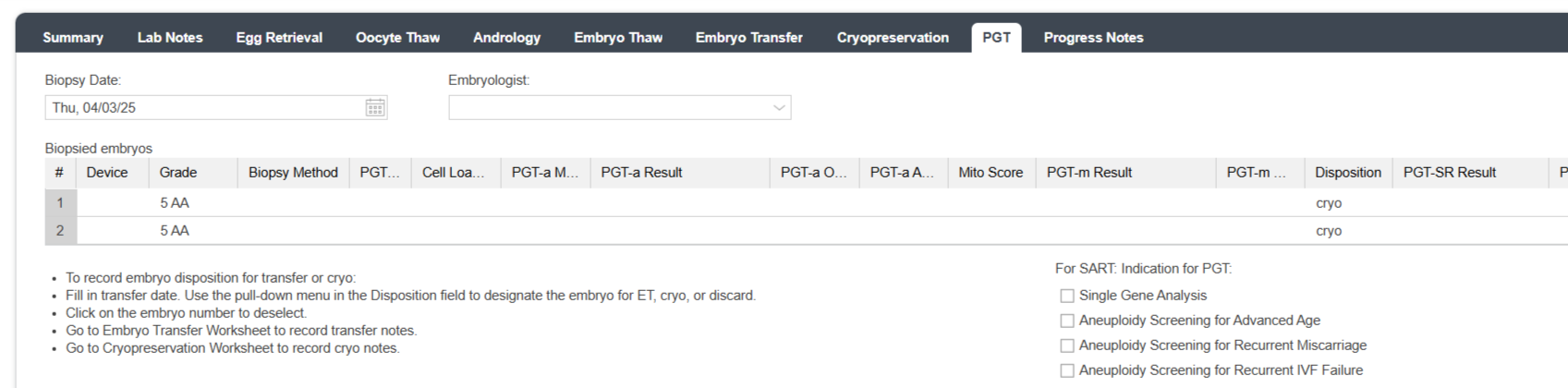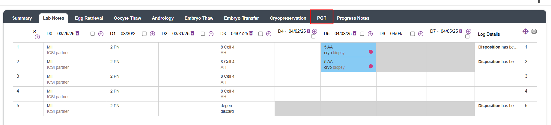 Lab Notes is used to track all aspects of an embryo's stages, including biopsy and testing results. Using the tools in Lab Notes and the PGT tab, all biopsy and PGT (PGS/PGD) results may be recorded and seamlessly incorporated into the cryolog.