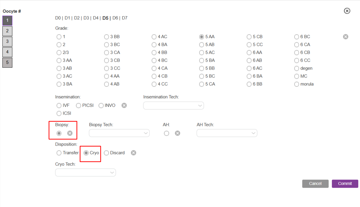 The embryos in this instance are marked for both "Cryo" and "Biopsy".