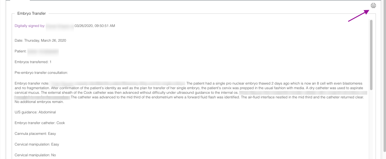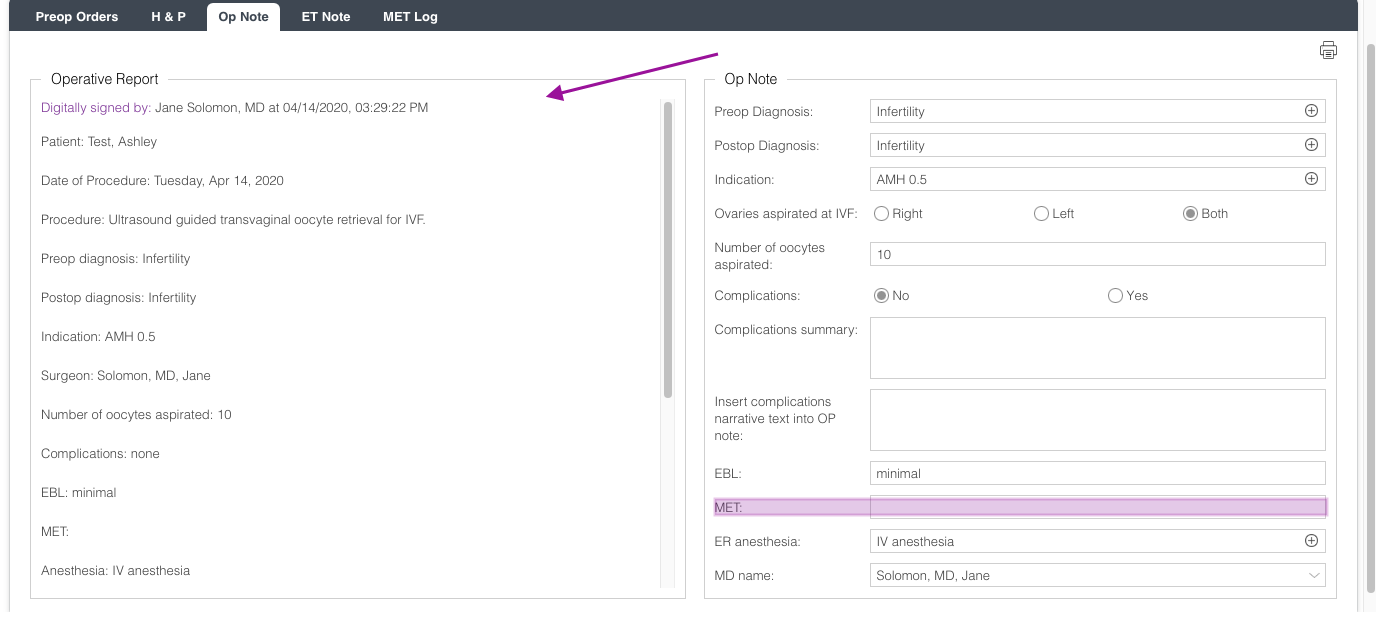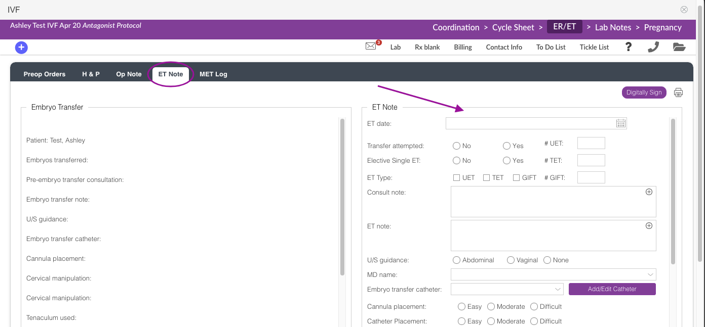 If it is your practice to perform a mock embryo transfer at egg retrieval, record the details in the MET field. The contents of this field will be automatically entered into the patient's Mock Embryo Transfer Log.