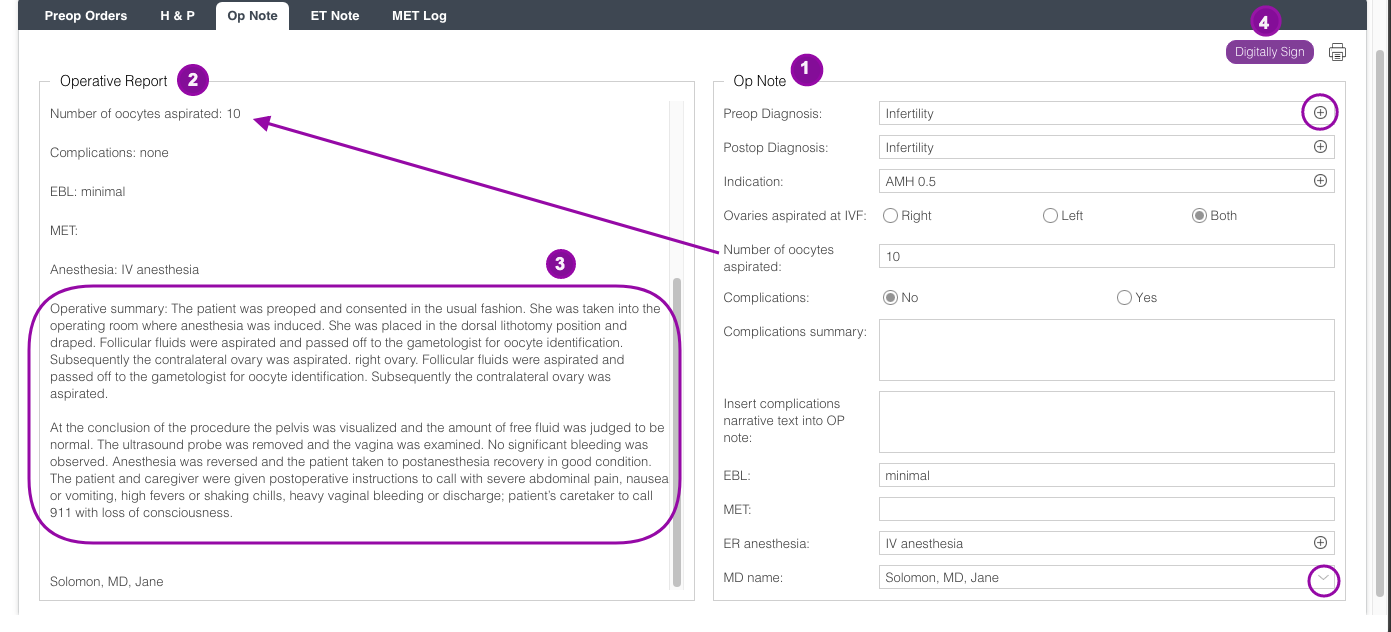 Artisan stores your center's standard operative report for the egg retrieval as a template. These orders are inserted into the Operative Report when a cycle is created. You may add any unique notes for the case.