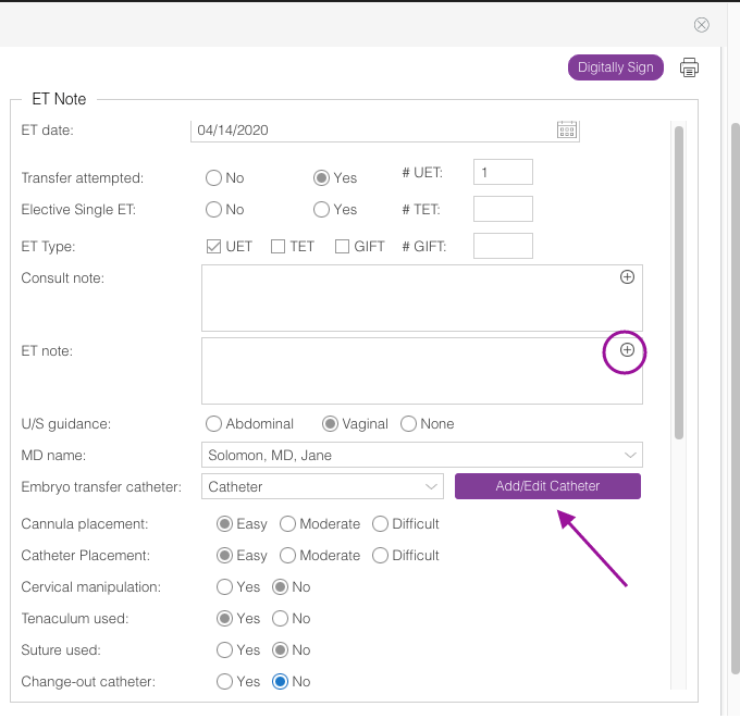 Click the + sign icon to use the stock text feature to enter your Consult Note and ET note if applicable.