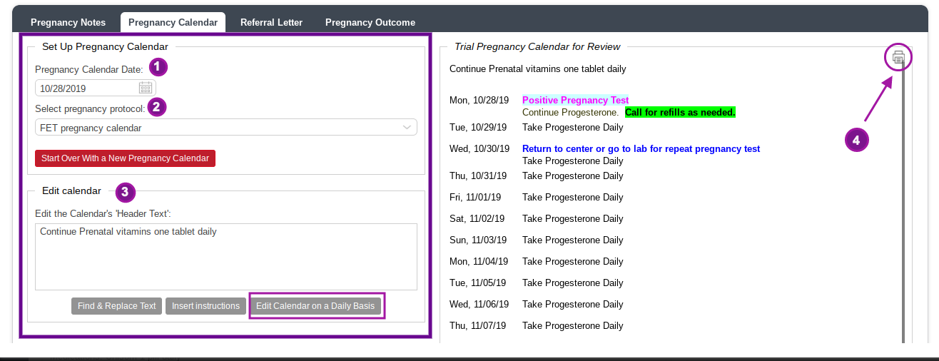 The Pregnancy Calendar tab generates instructions for newly pregnant patients based on the pregnancy protocols created in the ART Protocol Library.