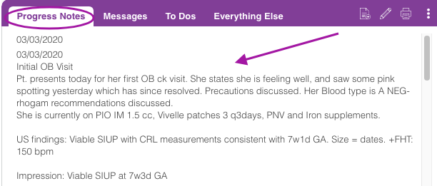 Prenatal notes from the pregnancy tab will also populate on the progress notes within the patient's chart.