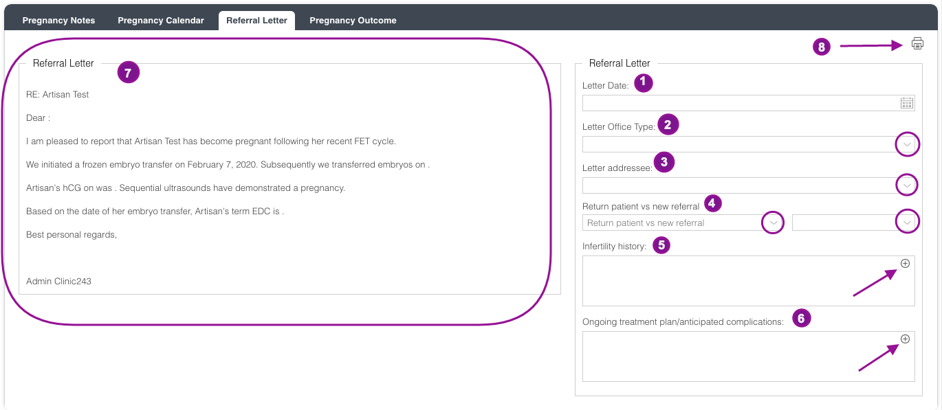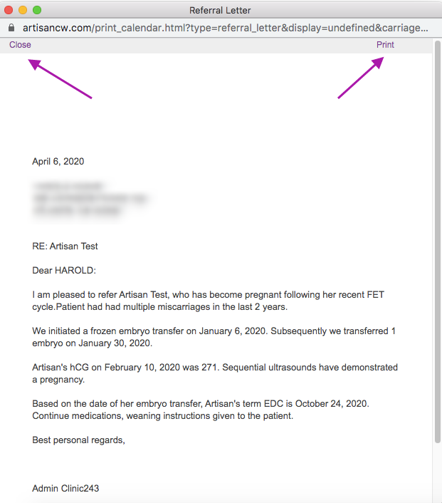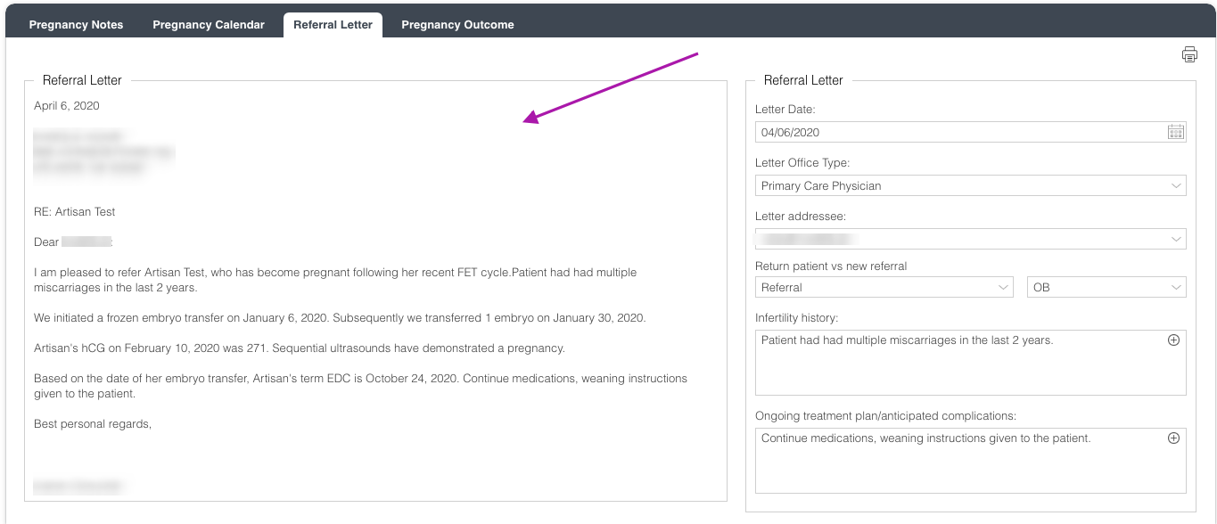 Artisan gathers information from the patient's ART treatment cycle and pregnancy notes to construct a referral letter for the patient.