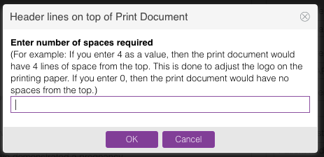 Once the printer icon is selected, this header lines option will pop up. Enter the numerical value inside the box and click ok to leave space for a logo or to print on letterhead.