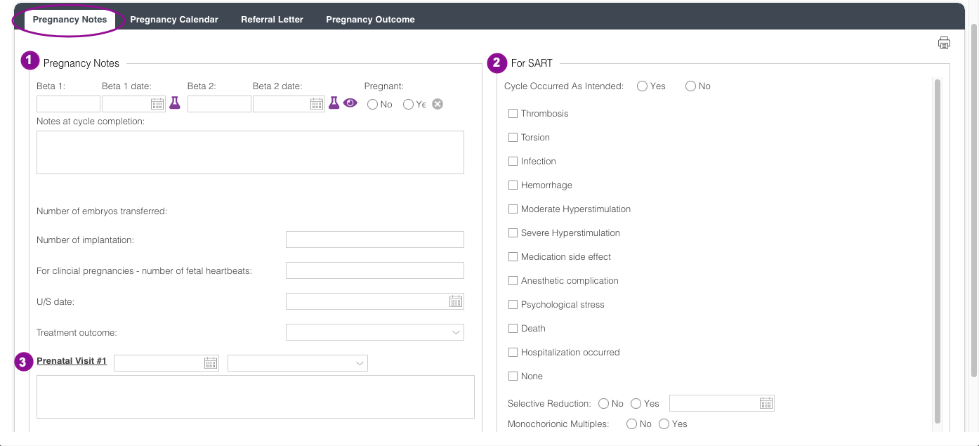 The pregnancy tab within a cycle creates patient instructions, letters to referring physicians and tracks pregnancy data for SART.