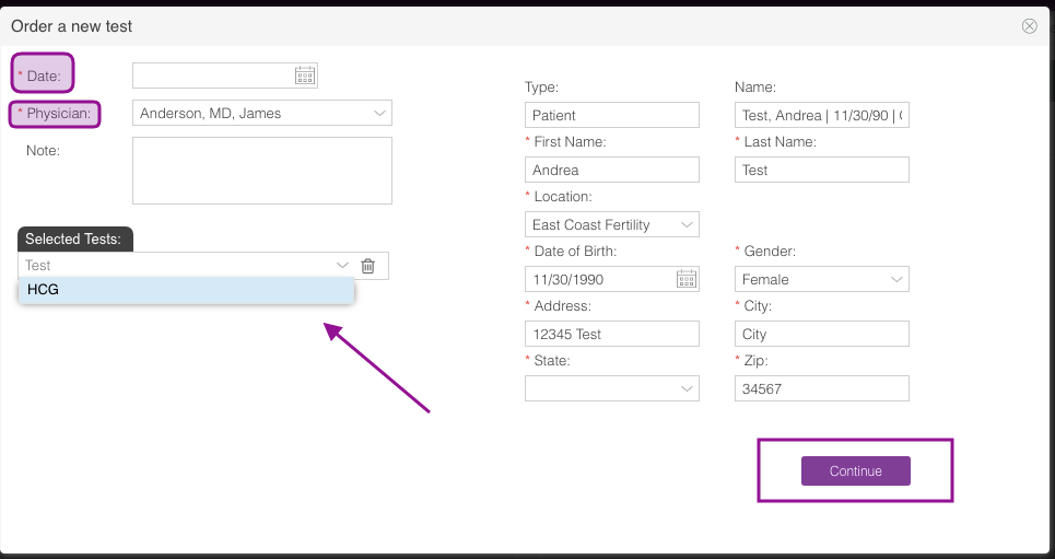Fill out the required fields: Date, Physician and select the appropriate test by clicking the drop down icon. Click continue.