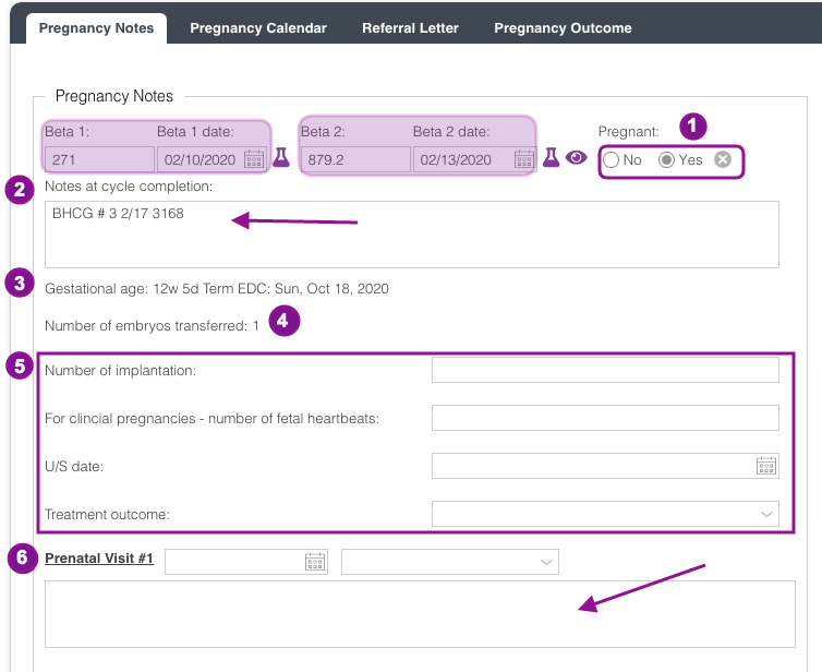 2. Notes at cycle completion: This is a free text box. Enter any pregnancy notes, if applicable. In the example above, a third beta result has been documented.