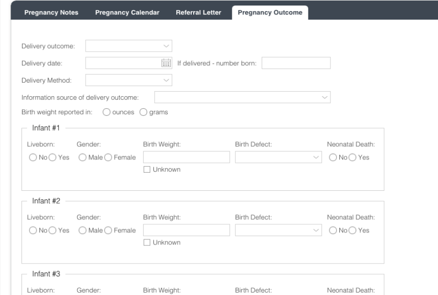Pregnancy Outcome tracks required data for SART reporting. This is the section of the system to record the delivery outcome for the cycle. Manually Enter the delivery outcome on the appropriate fields once the information is known.