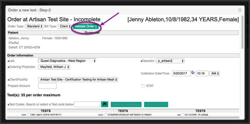 - Test Sent- Click this option if the test was sent to the lab. This must be clicked in order for the test to be sent to the lab and populate in Artisan.