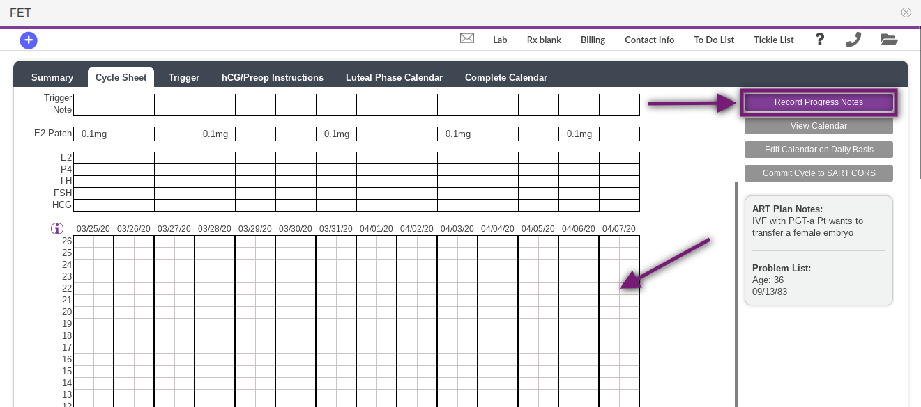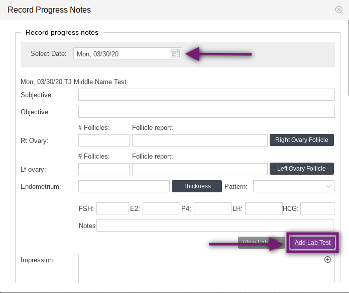 Labs may also be ordered in the Cycle Sheet within the cycle, click on Record Progress Notes or click directly into the day you would like to order tests from an outside lab on the ultrasound grid.