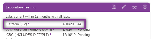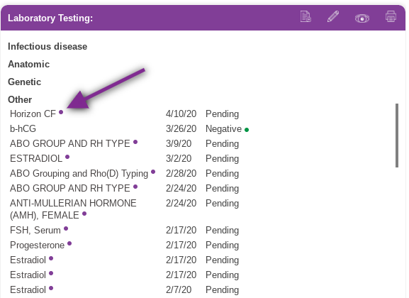 Under Laboratory Testing in the patient chart, any tests ordered through a lab integration with an outside lab will have a purple dot, indicating the test was sent to the lab. Prior to the test results being available in Artisan, the requisition can be pulled up by clicking on the test.