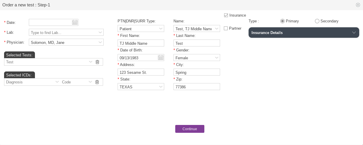 - Click the radio button for Insurance if the patient's insurance information will need to be included on the order. Leave the box unchecked if insurance will not be used.