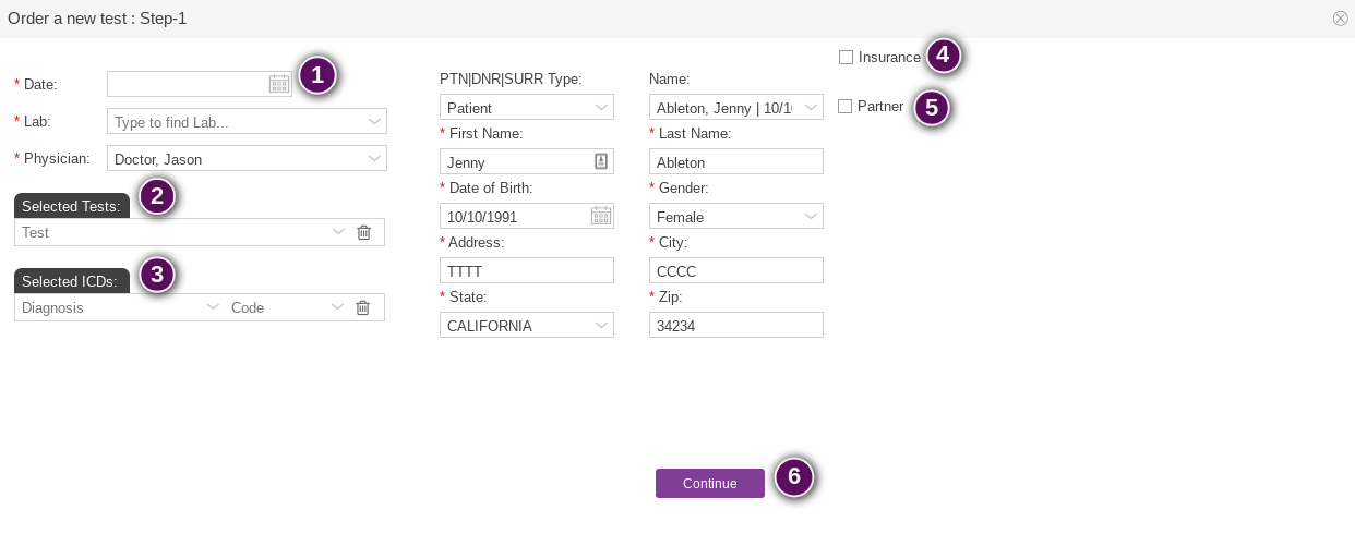 - Review the patient information. Click the radio button for Partner if the test(s) is being ordered for the partner.