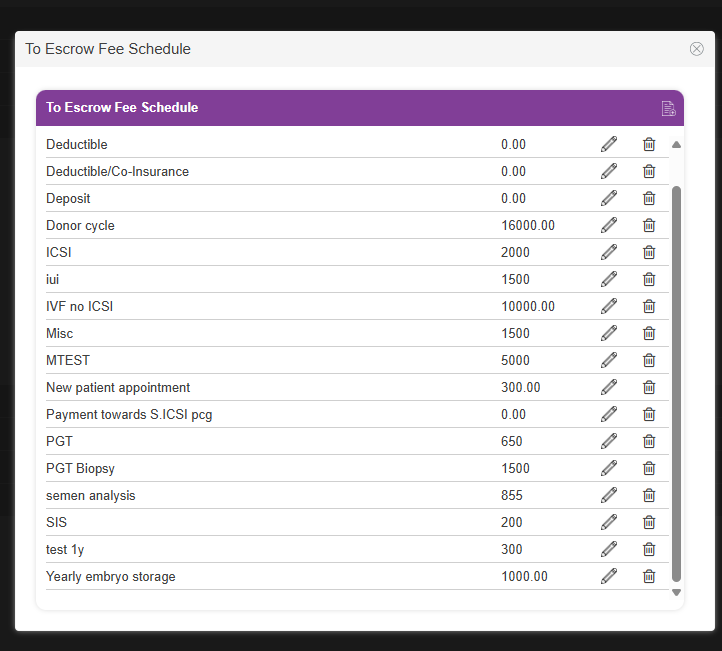 Create the To Escrow Fee Schedule for general escrow items that will be collected in advance that would not be considered part of your self-pay packages for treatment. Please see the Package Plan Set Up manual for setting up Package Plan Escrow Items.