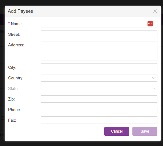 Enter the name of the Payee or Vendor into the Name field. If you have an address for that vendor, you can enter those details here. **If the payee is Patient, leave the address fields blank.**