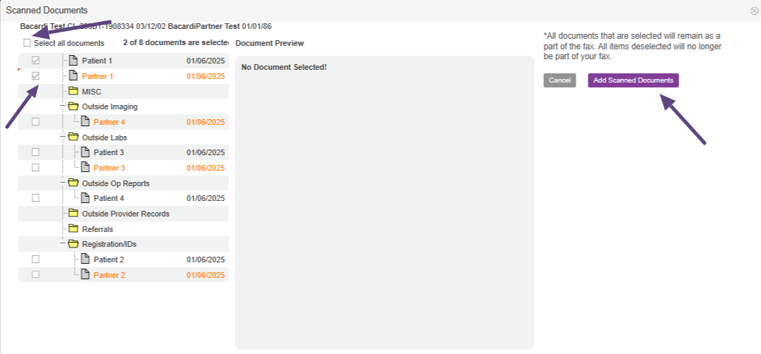 Click Select All if you wish to send all scanned documents. Otherwise, you can select which documents to send by clicking on the checkbox to the left of the document. Click Add Scanned Documents to move to the next step, or Cancel if you do not wish to send any documents.