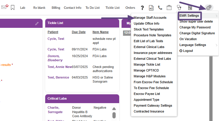 Click the Gears icon in the top right corner, hover over EMR Settings and select Manage Staff Accounts.