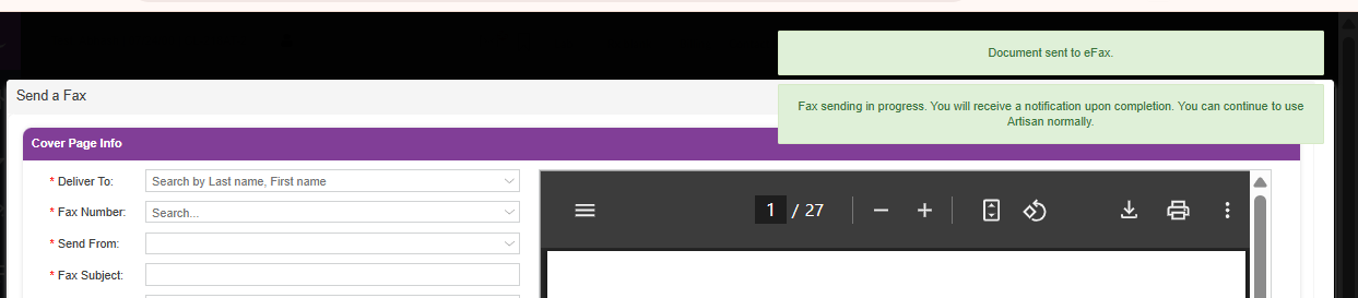 You will receive 2 green notification banners. The first one will let you know that the fax sending is in progress and you can continue to use Artisan normally. The second banner will alert you once the document has successfully been sent to e-fax.