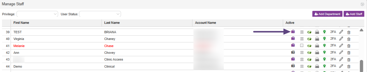 Click on the e-fax icon to the right of the account to disable it. Once disabled, the icon will appear gray. You can re-enable the e-fax function for users at any time.