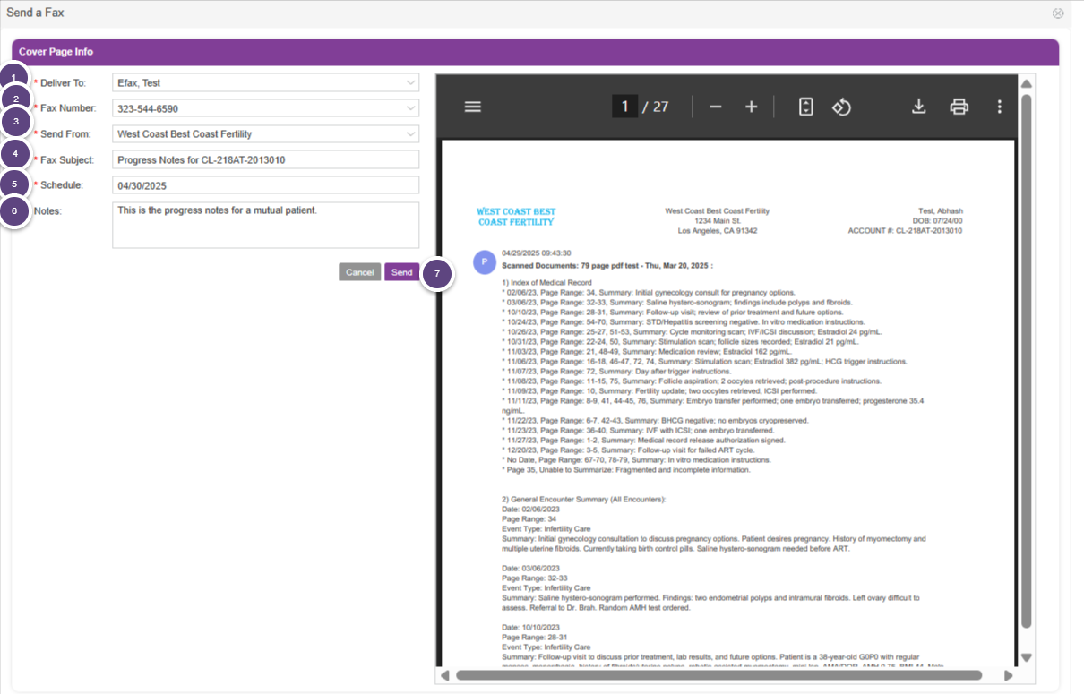 The records to be sent will pull into the preview window on the Send a Fax screen. Follow the below steps in order to send the e-fax.