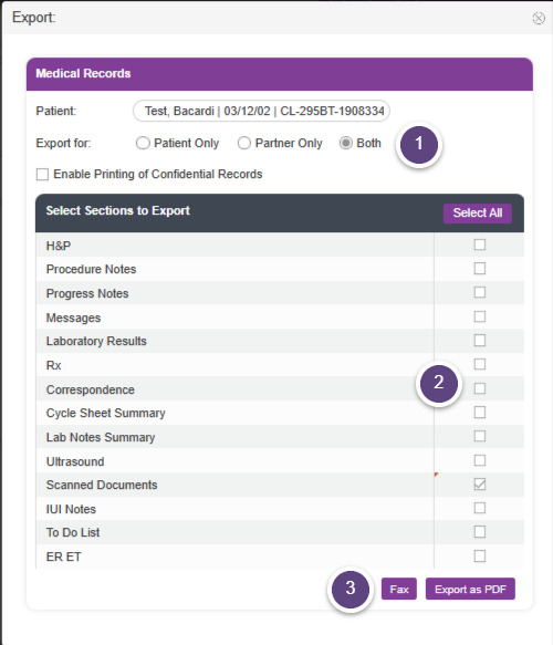 - Patient type- patient, donor or surrogate. Please note, any records that are sent for the partner are indicated under the Patient Type.