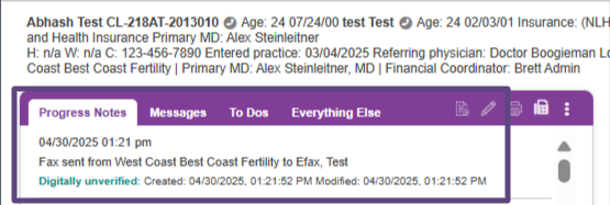 A progress note will automatically be generated with the date and time stamp of when the fax was sent, with information including the location the e-fax was sent from and who it was sent to.