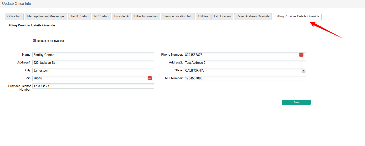 You can select default to all invoices and this will autofill the information put here to Box 33 on all claims.