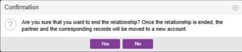 Once you select end relationship a verification window will pop up asking for you to confirm your selection. Once you confirm that you would like to end the relationship, the partner and their records will be moved to a separate patient account.
