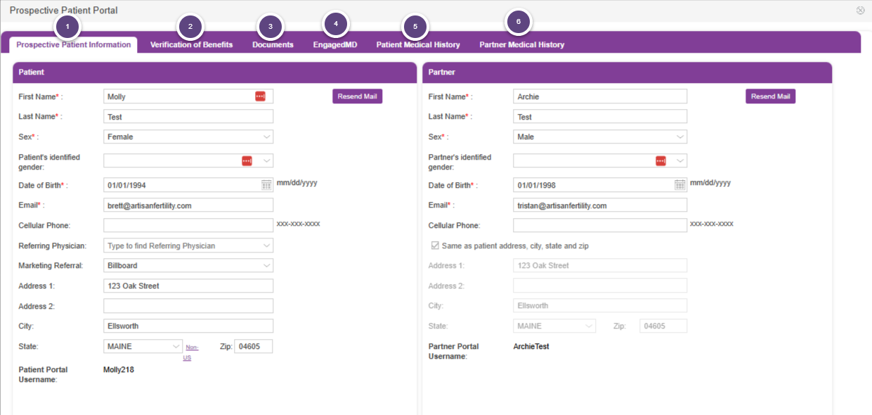 1. Prospective Patient information - displays patient and partner's (if applicable) basic information. This section will automatically update if this area has been updated within the patient's prospective portal.