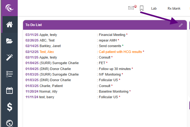 The Pencil Icon on your Home Page creates a new To Do item for a patient, donor or surrogate.