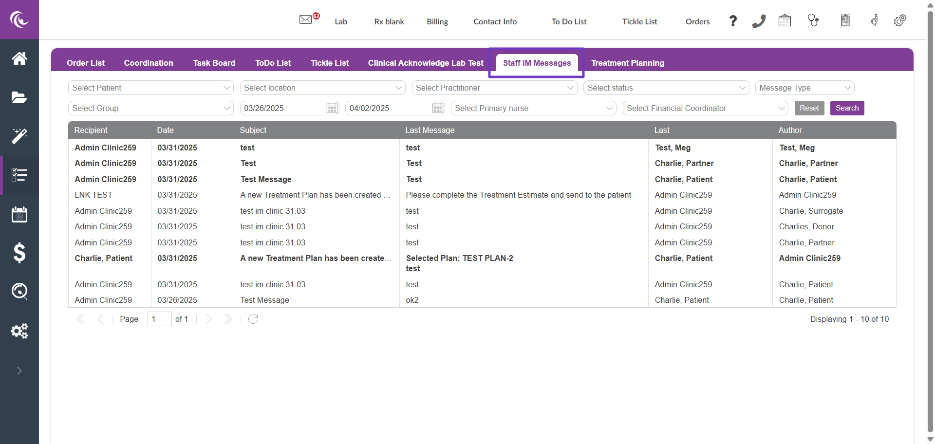 The tab Nursing staff IM messages allow users to view messages sent to other staff. This helpful feature will aid in seamless communication when staff is on call and need to manage communication with patients and/or when staff is out of the office.