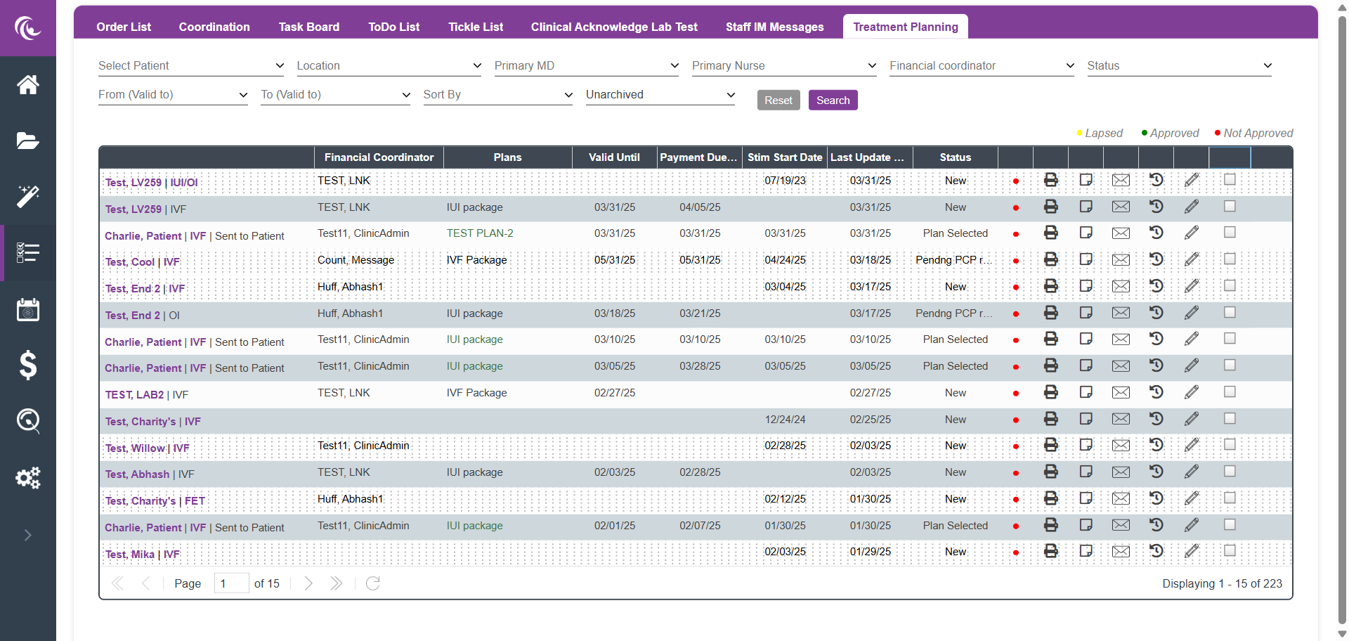 The To Do List tab allows you to see and manage items that have been assigned to staff either through a patient chart or directly to staff outside of a patient's chart. They can be filtered by patient's name, surrogate, donors, staff name, date range, or status.