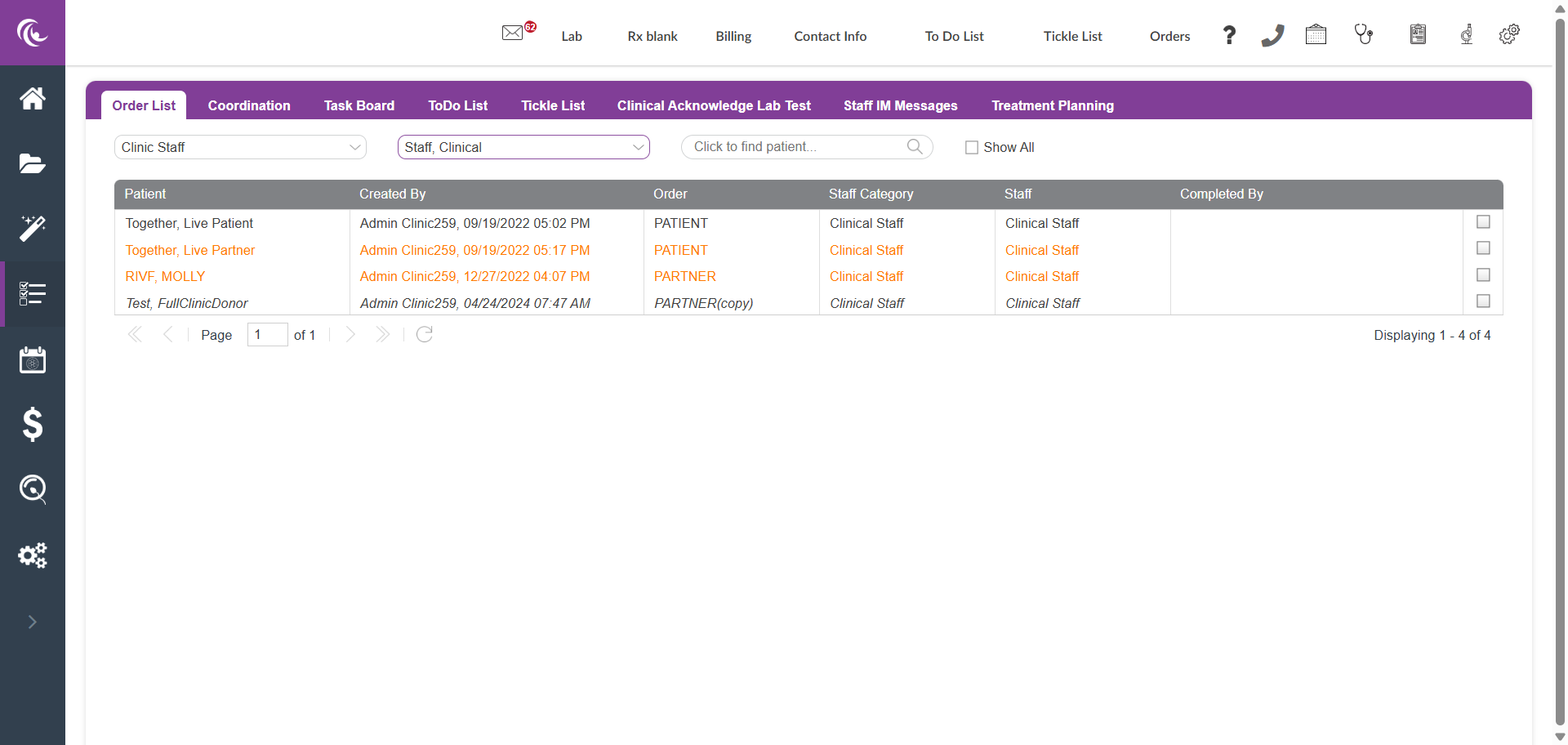 Note: The completed order list will also be available to view and manage within the patient's chart.