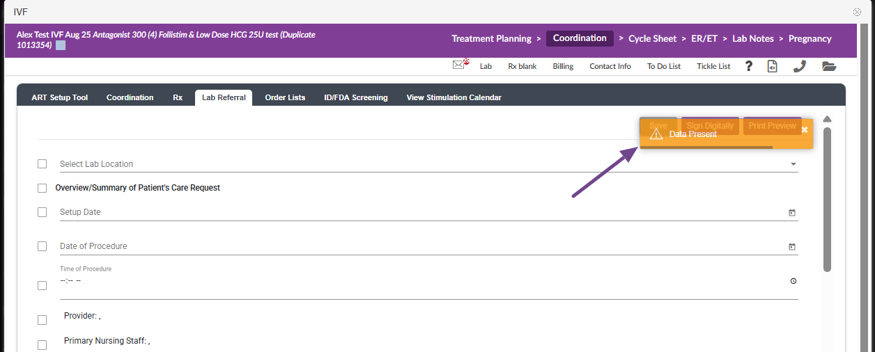 For all clinical staff and physicians, the lab referral will create a cycle summary page that will live on the front of the Cycle Sheet (or Stimulation sheet) for the patient's cycle. This will allow everyone to know exactly what is occurring for each patient in cycle.