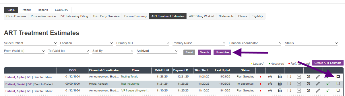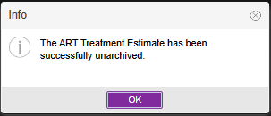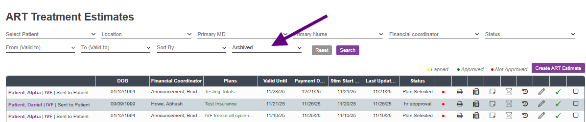 The ART Treatment Estimate tab will automatically default to the Unarchived view. To view Archived estimates, click the drop-down box and click Search.
