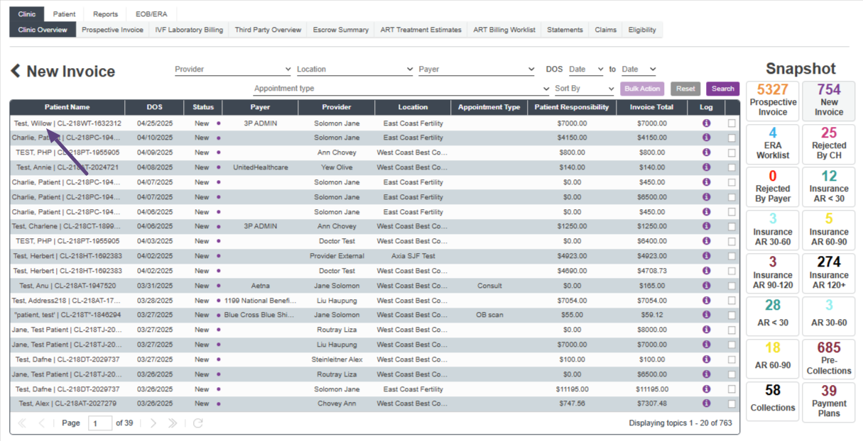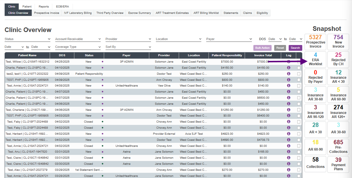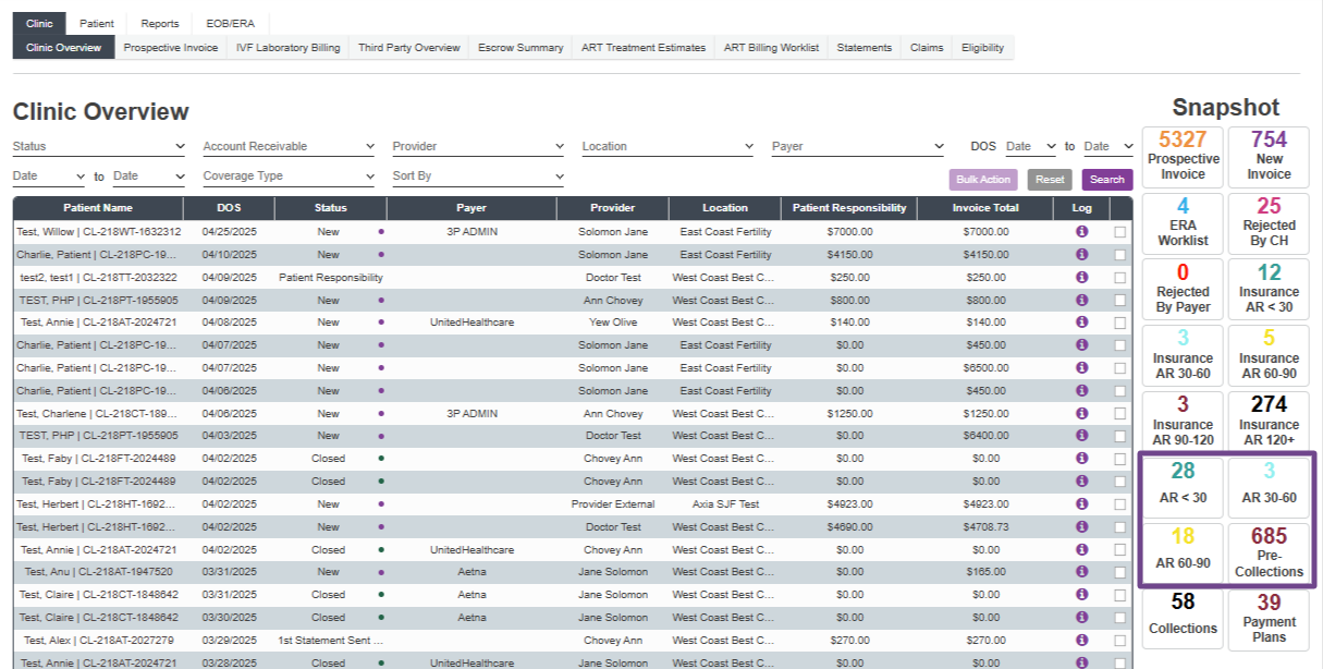 The Snapshots allow users to access pre-filtered worklists. The numbers in each snapshot allow users to see how many patient invoices are in each pre-filtered category.
