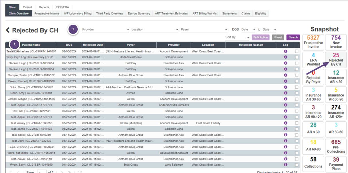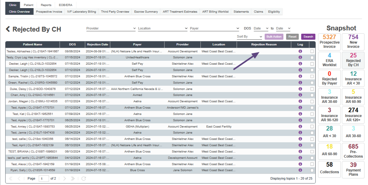 Any claims that are rejected by the clearinghouse, Change Healthcare, will be placed into the Rejected by CH snapshot.