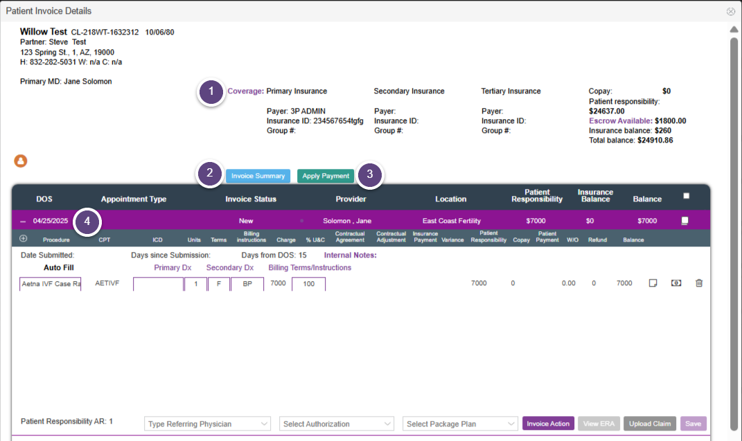 Click on the name of the patient to open the invoice for that date of service.