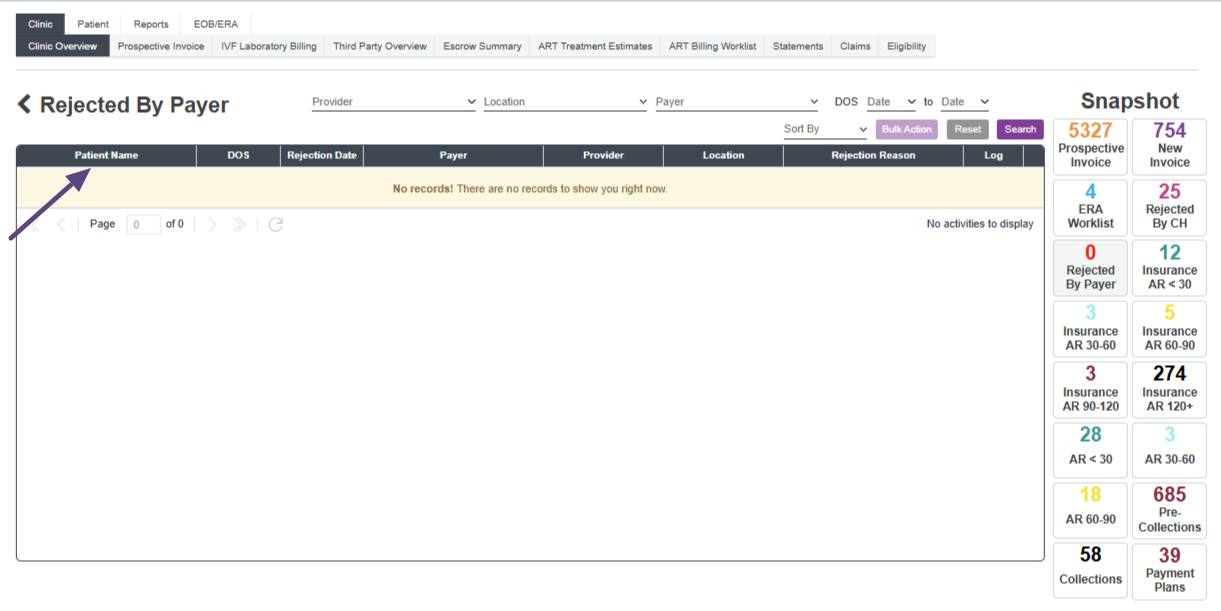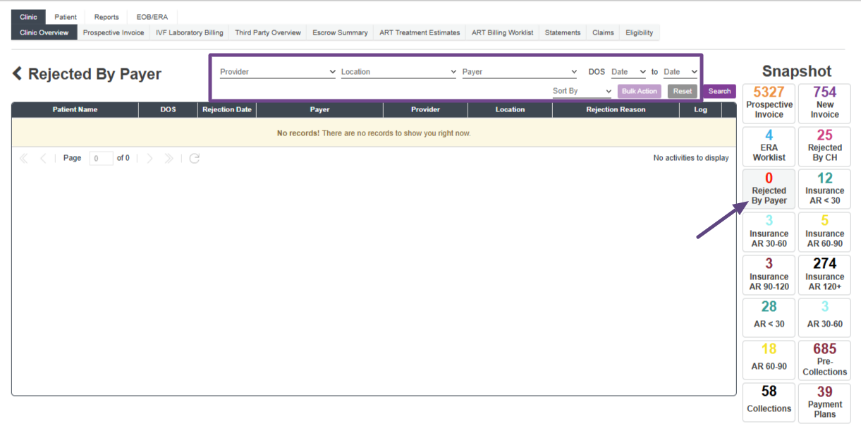 Any claims that are accepted by the clearing house but then are rejected by the payer, will be placed into the Rejected by Payer snapshot.