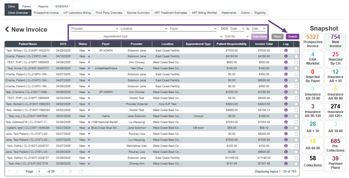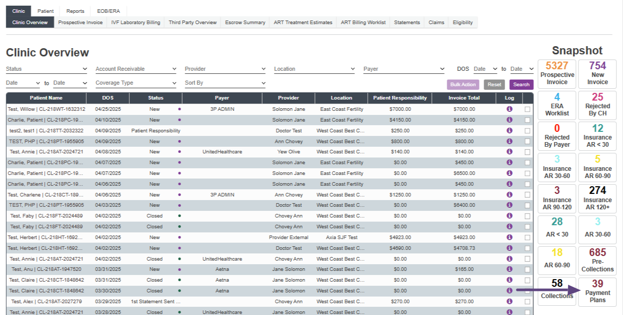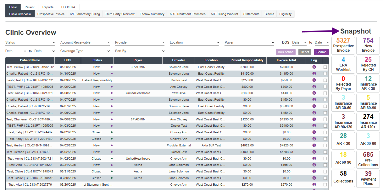 The Clinic Overview screen shows every invoice that has been created in the practice. It is important to note that this view does not include the prospective invoices. The Snapshots allow users to access pre-filtered areas within Accounting.
