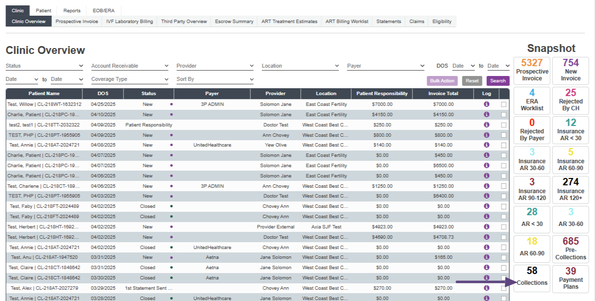 The Collections snapshot holds invoices where users have manually updated the status of the invoice to Collections. Any balances on line items will be written off to $0. A report can be built, upon request, to utilize for outside collections groups.