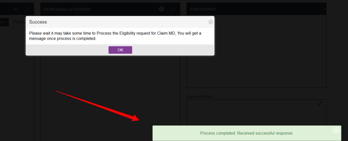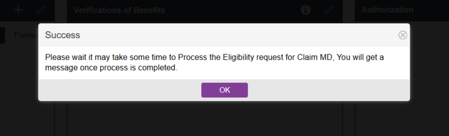 Once the eligibility is processed, you will see a banner appear in the bottom right-hand corner notifying you that the response was either successful or if there are any errors.