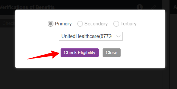 Select Primary, Secondary, or Tertiary. Using the dropdown, select the appropriate insurance you want to run eligibility for