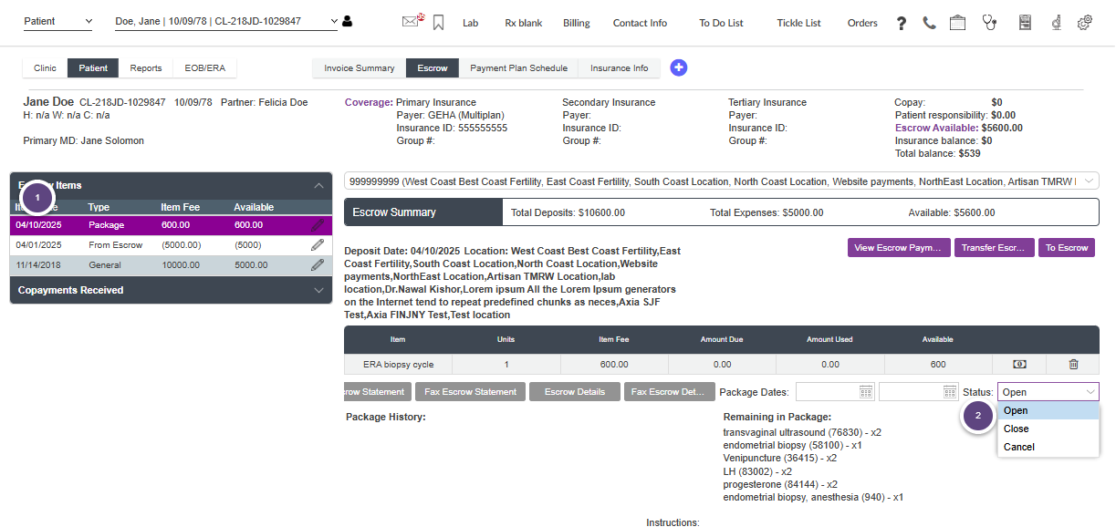 2. Click on the STATUS and change it from OPEN to CANCEL. This will create a CANCELED PACKAGE escrow item in the list.