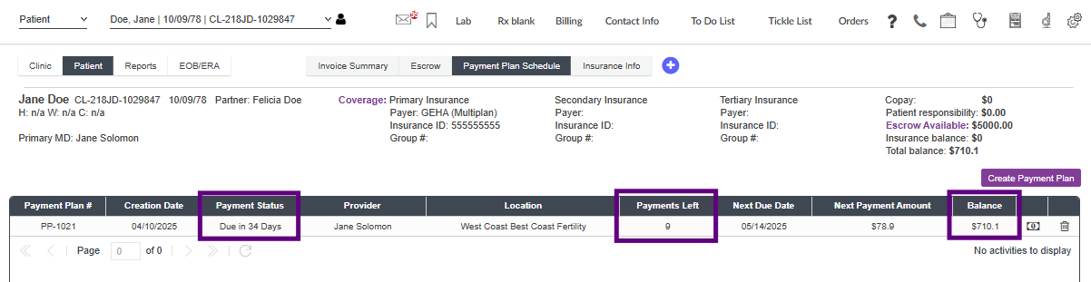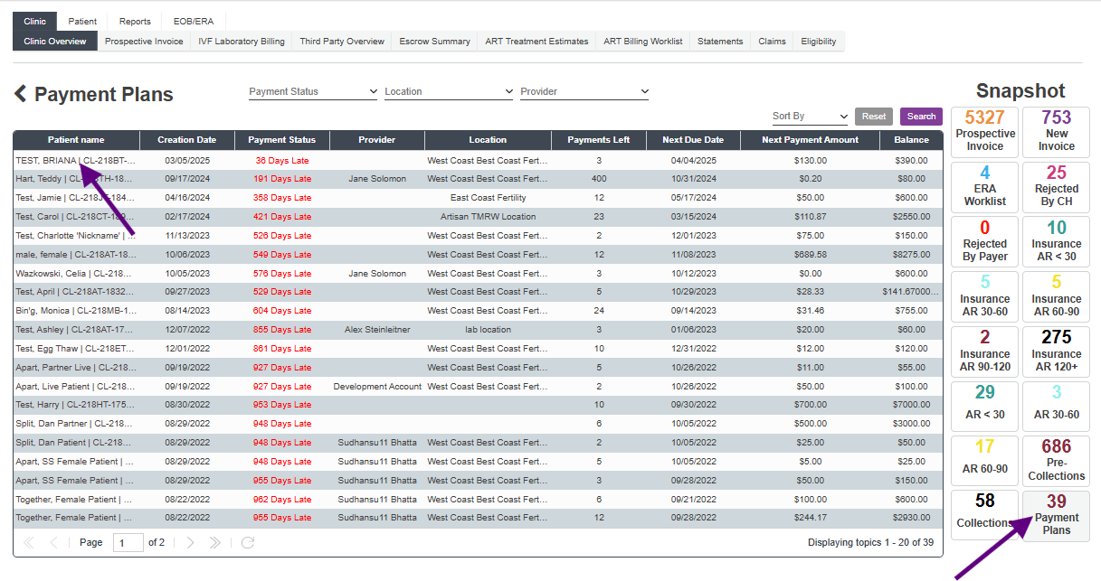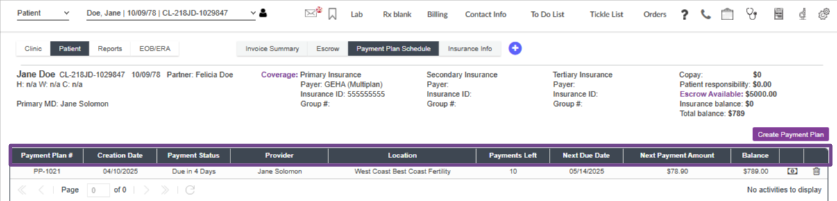 In the Clinic Overview tab, click on the Payment Plan snapshot. This view will show all patients currently in a payment plan.
