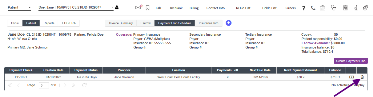 To delete a payment plan, click on the trash can icon.