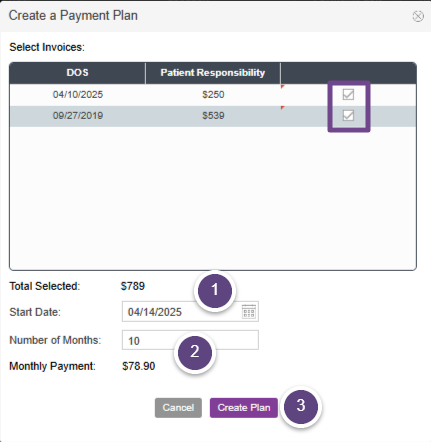 Any outstanding patient responsibility invoices will display in the invoice list. Click the checkbox(es) for the invoices you want to include in the payment plan.