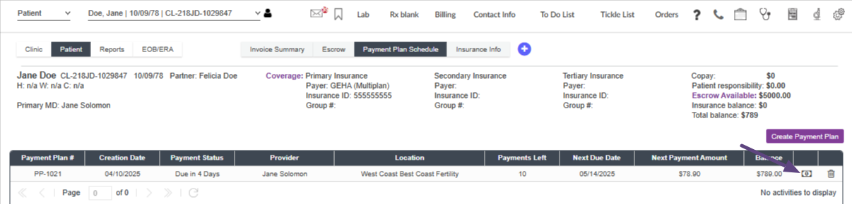 The dollar bill icon is where patient payments will be applied to the payment plan.