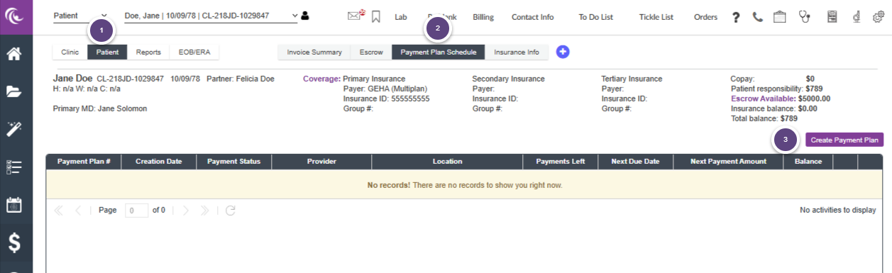 In the example above, after the patient payment was applied, the 1) the payment status, 2) the payments left, and 3) the balance have been updated.